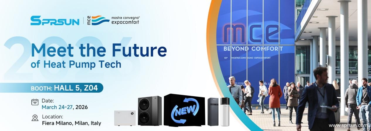 SPRSUN kondigt met trots zijn deelname aan MCE 2026 – Mostra Convegno Expocomfort aan, de belangrijkste wereldwijde beurs voor de HVACR-industrie, gehouden in Milaan, Italië. Van 24 tot 27 maart 2026 zullen we onze nieuwste serie lucht-waterwarmtepompen onthullen, ontworpen om nieuwe maatstaven te stellen op het gebied van efficiëntie en prestaties.